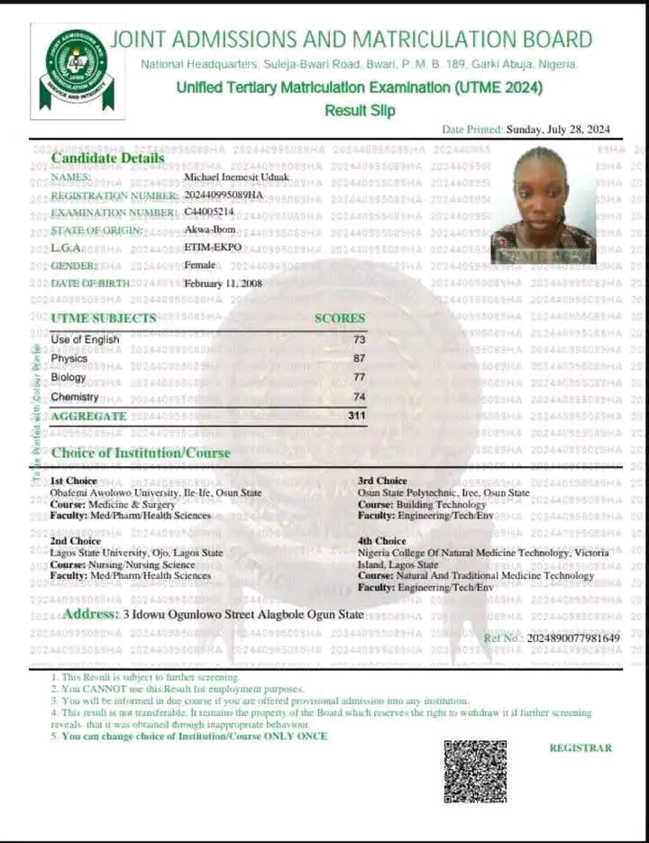 According to her 2024 UTME result slip, shared by Igbere TV, Uduak scored 73 in Use of English, 87 in Physics, 77 in Biology, and 74 in Chemistry — totaling 311.